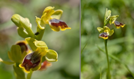Another note we did was for Ophrys tenthredinifera or O. grandiflora as we might call it now. What I remember from our last visit in these parts of Sicily (2003) this was one of the more common that we saw. Now, we did not find many and very few if any of that really big, colorful variety. In contrast, what we failed to do last time, was finding Ophrys lacaitae, the much sought after, large-flowered, yellow Ophrys. This year we had it on at least four different sites. In addition, we also found what looked to be hybrids with O. calliantha respective O. oxyrrhynchos.